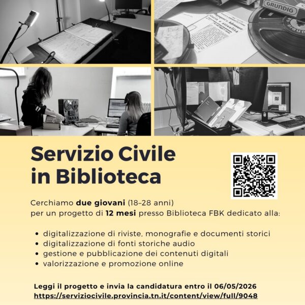 15 Aprile 2026Progetto di Servizio civile (giugno 2026-maggio 2027) presso la Biblioteca FBK
